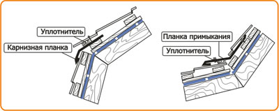 На внешних изломах используется карнизная планка. Между верхним листом и карнизной планкой приклейте уплотнитель. На внутренних изломах используется планка примыкания. Между нижним листом и планкой примыкания приклейте уплотнитель.