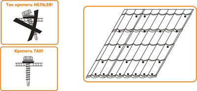 Листы металлочерепицы крепятся саморезами с уплотнительной шайбой в прогиб волны, под поперечной ступенькой профиля, перпендикулярно обрешетке. Расход саморезов примерно 6-8 шт. на 1м.кв. Схему крепления листов смотрите на рисунке.